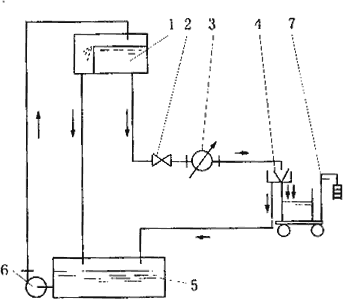 电磁流量计质量时间法校准装置和串联校准图 二、质量-时间法 本方法与容积-时间法相仿,仅用精确的衡器代替标准容器,如图8-4所示。因衡器的精度高(一般为10-5),所以质量-时间法的校准精度要比容积-时间法更高些,可以在0.02%~0.05%之间。 图8-4 质量-时间法流量校准装置示意图 1-正压容器;2-阀;3-被检流量计;4-换向器;5-下水池;6-泵;7-标准衡器 电磁流量计测量的是体积流量。在装置上用水进行重量-时间法校准时要考虑密度变化的影响和浮力修正问题。流量可按下式计算 式中 W——衡器称得的水重量,kg; t——测量时间(水流入衡器的时间),s; 式中 表8-1 水在不同温度时的密度
