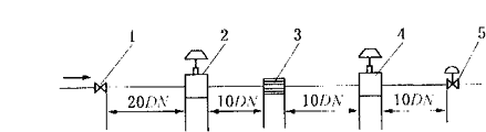 本类装置是精确度最高的装置。因液体静止时称重,管路系统没有任何机械连接,不受流动的动力影响。可采用高精确度的称重设备,如精确度0.01%~0.005%的标准衡器。装置的精确度一般为0.05%~0.1%,最高可达0.02%。 三、标准表比较法 上述两种标定方法的设备都比较复杂,投资较大,不是每一个单位都有条件设置的。采用标准表比较法就较为简单方便。 本方法是用精确度高一等级的标准流量计与被校验流量仪表串联,流体同时流过二者,比较二者的示值,确定被检表的误差,达到校准的目的。 这种方法费用最省,操作简单,也有制成流动车装式标准表校准设备的。本方法近年来为国内各界重视和认可,国家技术监督局制作了相应的“检定规程”,颁布有JJG643-94《标准表法流量标准装置检定规程》。 装置准确度应不低于被检表准确度的1/2。标准表的前后直管段,一般不小于同类型普通表直管段的长度,被校表的前后直管段,应满足该表说明书要求。标准表与被校表之间连接管段的容积,在满足直管段要求的条件下应尽量小。流量调节阀一般应安装在表的下游侧,调节性能要稳定。 图8-5所示是通用的一台标准流量计(通常为涡轮流量计或电磁流量计)与被校准流量计串联校准图。 图8-5 串联校准图 1-截止阀;2-被校流量计;3-流动调整器;4-标准流量计,5-流量调节阀 被校准流量计2装在标准流量计4的上游,中间装有流动调整器3,流量调节阀5装在标准流量计4的后直管段10DN后,通过流量调节阀5调节流体的流量到所需要的值。如标准流量计不用涡轮流量计而用电磁流量计校准电磁流量计,则毋需装流动调整器3,被校准流量计前和两流量计间直管段长度均可缩短为10DN。