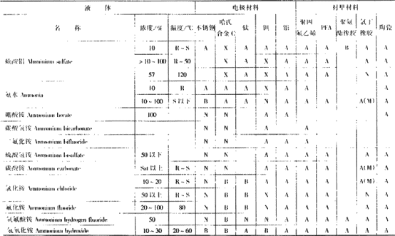 电极和衬里耐腐蚀材料选择一览表(2)