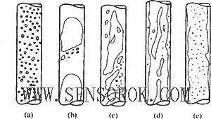 3.7.3 气液两相流及其流量测量 (1) 气液两相流及其流动结构 液体及其蒸汽或组分不同的气体及液体一起流动的现象成为气液两相流。前者称为单组分气液两相流,后者称为多组分气液两相流。气液两相流在动力、化工、石油、冶金等工业设备中是常见的,在流动时气相和液相存在流速差,在测量流量时应考虑此相对速度。 气液两相流按流动方向不同,存在多种流动结构。图3.86所示为垂直上升管中的气液两相流动结构;图3.87所示为垂直下降管中的气液两相流动结构;图3.88所示为水平管中的气液两相流动结构。 ① 垂直上升管中的气液两相流动结构。实验研究证明,在垂直上升管中的气液两相流动,其基本结构有下列五种:细泡状流动结构、弹状流动结构、块状流动结构、带纤维的环状流动结构和环状流动结构。 图3.86垂直上升气液两相流的流动结构 (a)细泡状流动结构;(b)弹状流动结构;(c)块状流动结构;(d)带纤维的环状流动结构;(e)环状流动结构 这五种流动结构分别具有下列特点。 a. 细泡状流动结构。细泡状流动是最常见的流动结构之一,其特征为在液相中带有散布的细小气泡。直径小于1mm的气泡是球形的,直径大于此值的气泡,其外形是多种多样的。 b. 弹状流动结构。弹状流动结构由一系列气弹组成,气弹端部呈半球状,而尾部是平的,在两气弹之间夹有小气泡,气弹与管壁之间的液膜是往下流动的。 c. 块状流动结构。块状流动结构是由于气弹破裂而形成的,此时,气体块在液流中以混乱状态进行流动。 d. 带纤维的环状流动结构。在带纤维的环状流动结构中,管壁上液膜较厚且含有小气泡,被中心部分气核从液膜带走的液滴在气核内形成不规则的长纤维形状,这种流型常在高质量流速时出现。 e. 环状流动结构。在环状流动结构中,管壁上有一层液膜,管道中心部分为气核,在气核中带有因气流撕裂管壁液膜表面而形成的细小液滴。 图3.87垂直下降气液两相流的流动结构 (a)细泡状流动结构;(b)弹状流动结构;(c)带下降液膜的环状流动结构;(d)带含泡下降液膜的环状流动结构;(e)块状流动结构;(f)环状流动结构 ②垂直下降管中的气液两相流动结构。从图3.87所示的气液两相流在直管中垂直向下流动时的流动结构可以看出,气液两相作垂直下降流动时的细泡状流动结构和作垂直上升流动时的细泡状流动结构不同,前者细泡集中在管子核心部分而后者则散布与整个管子截面上。当液相流量不变而使气相流量增大,则细泡将聚集成气弹,形成具有下降弹状流动结构的气液两相流。垂直下降气液两相流也可形成下降流动的环状流动结构。当气相及液相流量小时,管壁上有一层向下流动的液膜,管子中心部分为向下流动的气核,这种流动结构称为带下降液膜的环状流动结构。如液相流量增大,气泡将进入液膜,形成带含泡下降液膜的环状流动结构。当气液两相流量都增大时会出现向下流动的块状流动结构。当气相流量继续增大,气液两相流可具有管壁上有下降液膜,管子中心部分为带液滴的下降气核的环状流动结构,这种环状流动结构和垂直上升气液两项流的环状结构相近,但流动方向相反。 ③水平管中的气液两相流动结构。气液两相流体在水平管中的流动结构比在垂直管中更为复杂,其主要特点为所有流动结构都不是轴对称的,这主要是由于重力的影响使较重的液相偏向于沿管道下部流动造成的。 实验研究表明,气液两相流在水平管中流动时,其基本流动结构有下列六种:细泡状流动结构、柱塞状流动结构、分层流动结构、波状流动结构、弹状流动结构和环状流动结构。 图3.88是这些流动结构的示意。由图可见,这些流动结构分别具有下列特点。 图3-88水平气液两相流的流动结构 a. 细泡状流动结构。水平管中的细泡状流动结构和垂直管中的不同,由于重力的影响,细泡大都位于管子上部。 b. 柱塞状流动结构。当气相流动增加时,小气泡合并成气塞,形成柱塞状流动结构。柱塞倾向于沿管子上部流动。 c. 分层流动结构。当气液两相流量均小时会发生分层流动结构。此时气液两相之间存在一平滑分界面,气液两相分开流动。 d. 波状流动结构。当气相流量较大时,气液两相分界面上会出现流动波,形成波状流动结构。 e. 弹状流动结构。当气相流量再增大时,气液两相流的流动结构可以从波状转变为弹状流动结构。此时,气液分界面由于剧烈波动而在某些部位直接和管子上部接触,将位于管子上部的气相分隔为气弹,形成弹状流动结构。在水平流动时,气液两相流的气弹都沿管子上部流动。 f. 环状流动结构。在水平流动时,气液两相的环状流动结构出现于气相流量较高的工况。水平流动时的环状流动结构和垂直上升时的环状流动结构相近,管壁上有液膜,管子中心部分为带液滴的气核,但由于水平流动时重力的影响作用,下部管壁的液膜要比上部管壁的厚。 在油田常经分离设备将液气分离,然后分别测液相和气相流量。 (2)气液两相流体的流量测量方法 从制造商提供的资料可看出,有几种仪表可用来测量离散相浓度不高的两相流体的流量,来自用户的报道也有一些成功应用的实例,但目前使用的流量计都是在单相流动状态下评定其测量性能,现在还没有以单相流标定的流量计用来测量两相流时系统变化的平定标准,因此这样的应用究竟带来多大的误差还不很清楚,仅有一些零